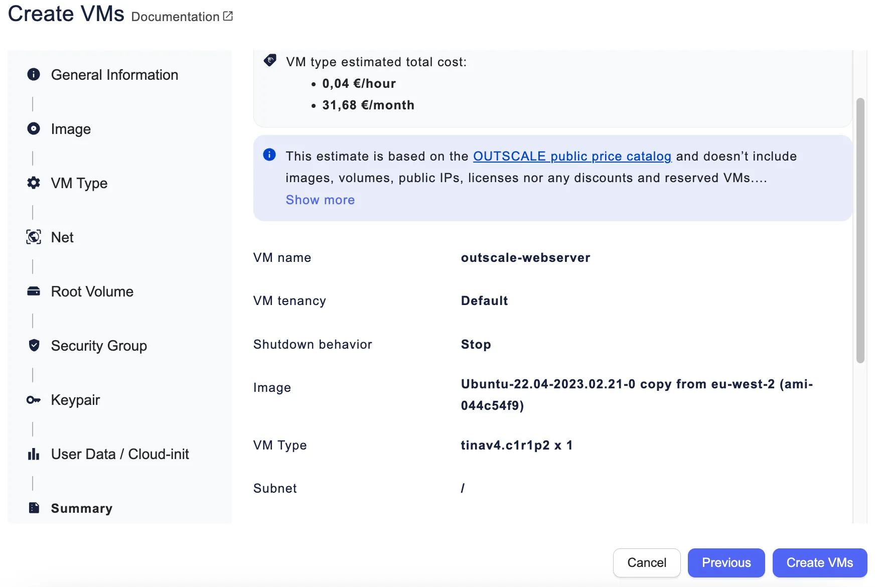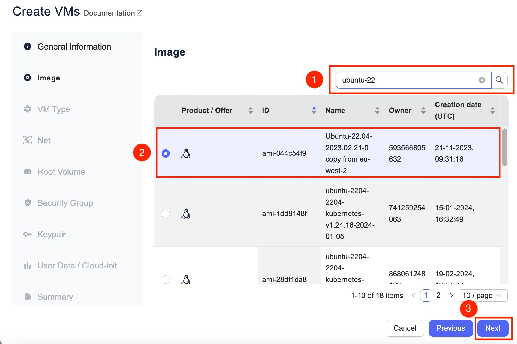 - Choisir l’image ubuntu-22.04 qui a comme propriétaire Outscale