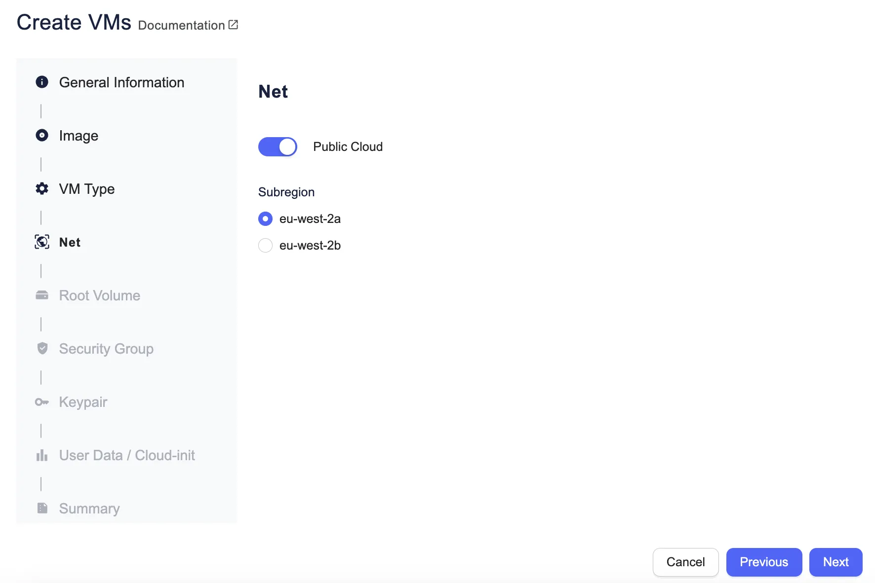 - Sélectionnez la sous-région dans laquelle vous voulez lancer la VM. (Dans le Cloud public, vous ne pouvez pas définir l’IP privée de vos VM.)