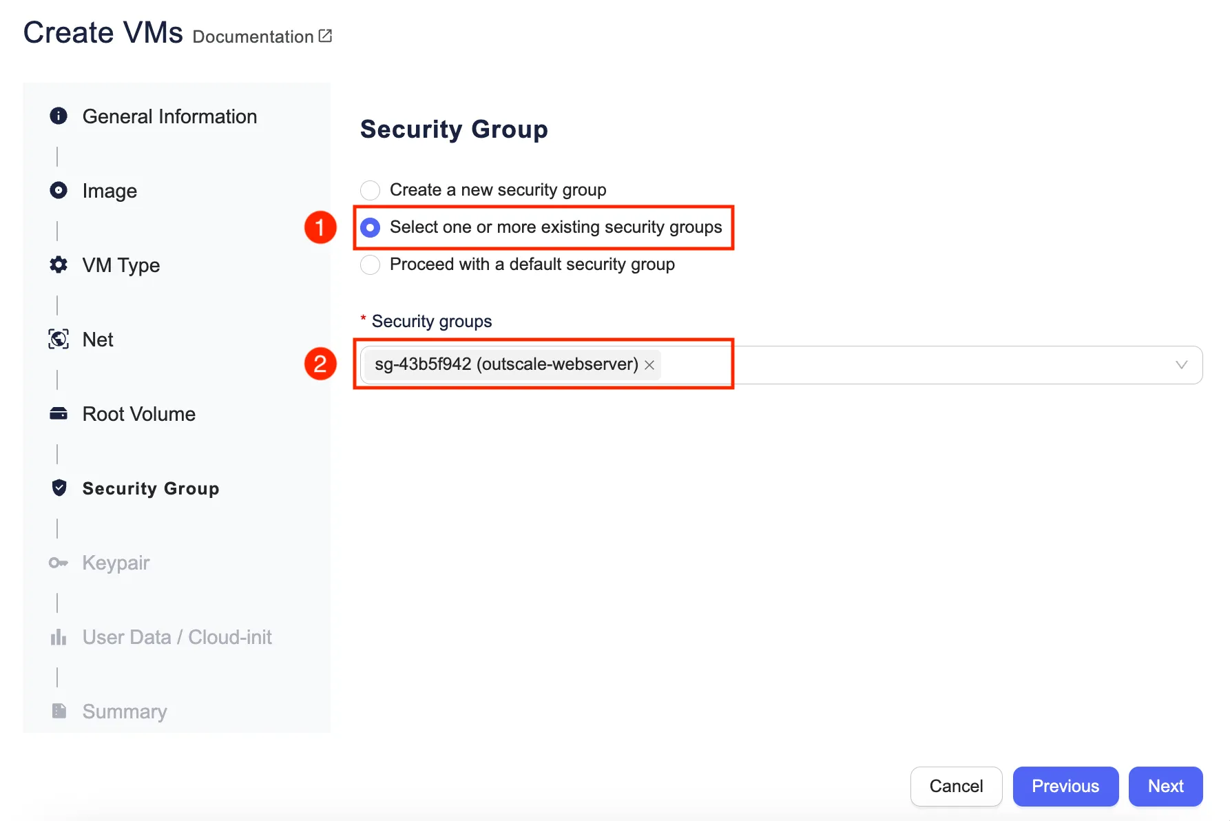 - Pour créer un security group pour le Cloud public, sélectionnez