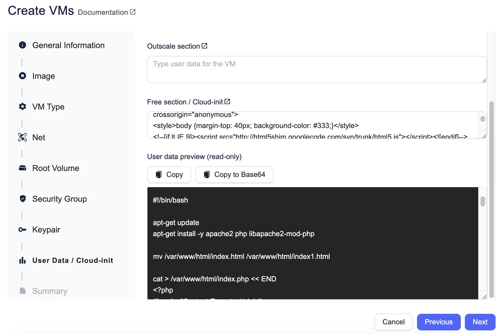 - Copier-coller le script suivant dans le champ section libre des User data :