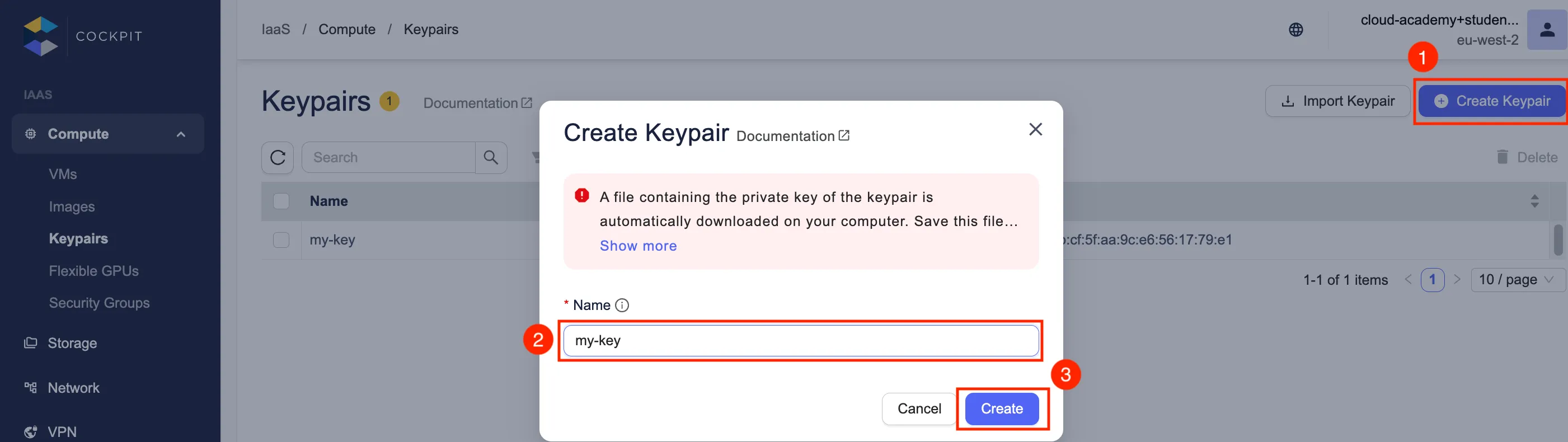 - Pour créer une paire de clés SSH, cliquez sur le bouton [Créer une Keypair] en haut de la fenêtre. +