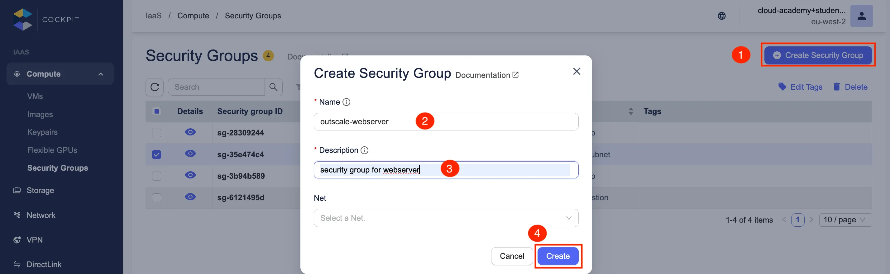 - Dans le dashboard Security Groups, cliquez sur [Créer un security group].