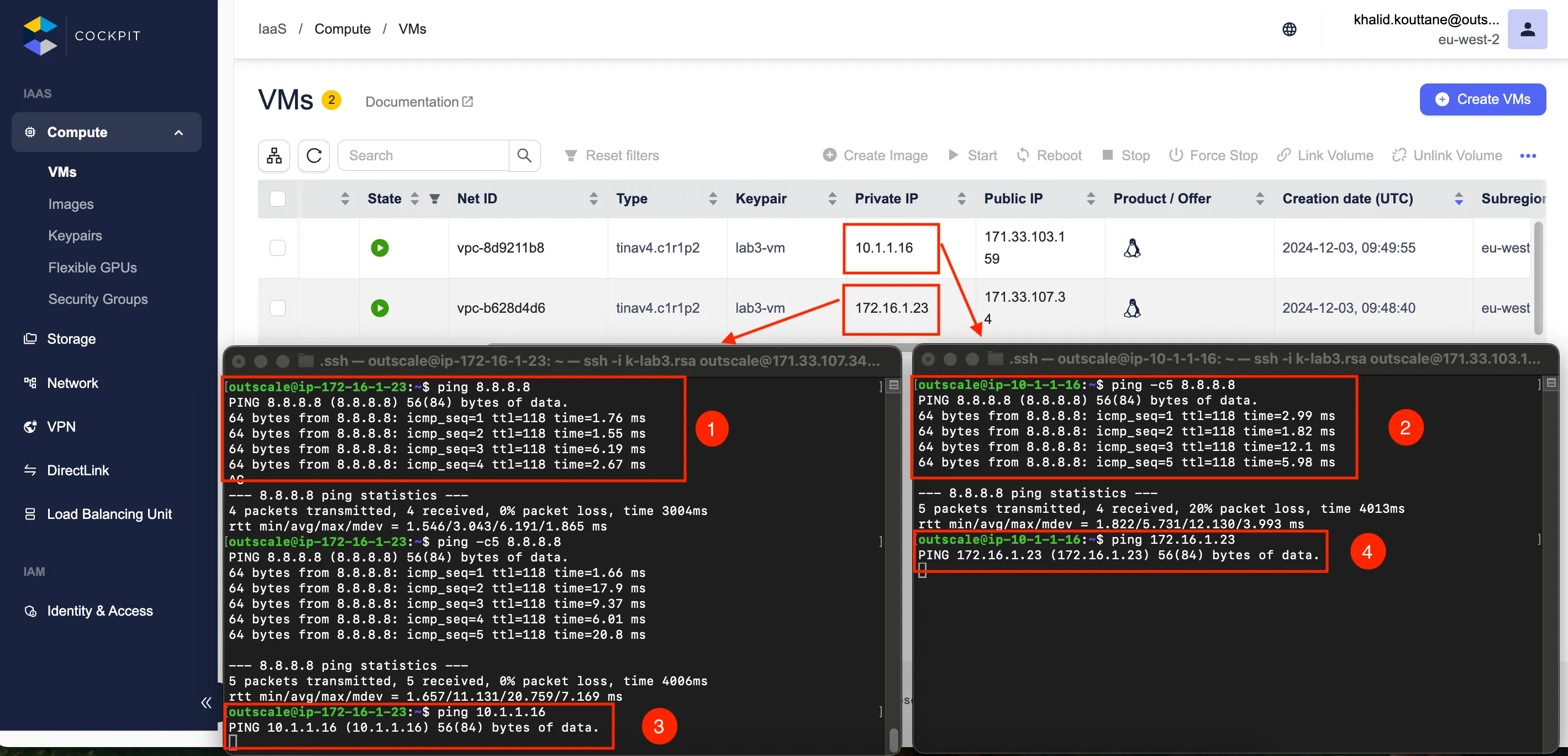 Les deux instances (VM1 et VM2) disposent d’une connexion Internet, comme en témoigne le succès du ping vers 8.8.8.8 (1) et (2). Cependant, le test de ping entre les deux instances ne fonctionne pas, comme on peut le voir sur la capture d’écran (3) et (4).