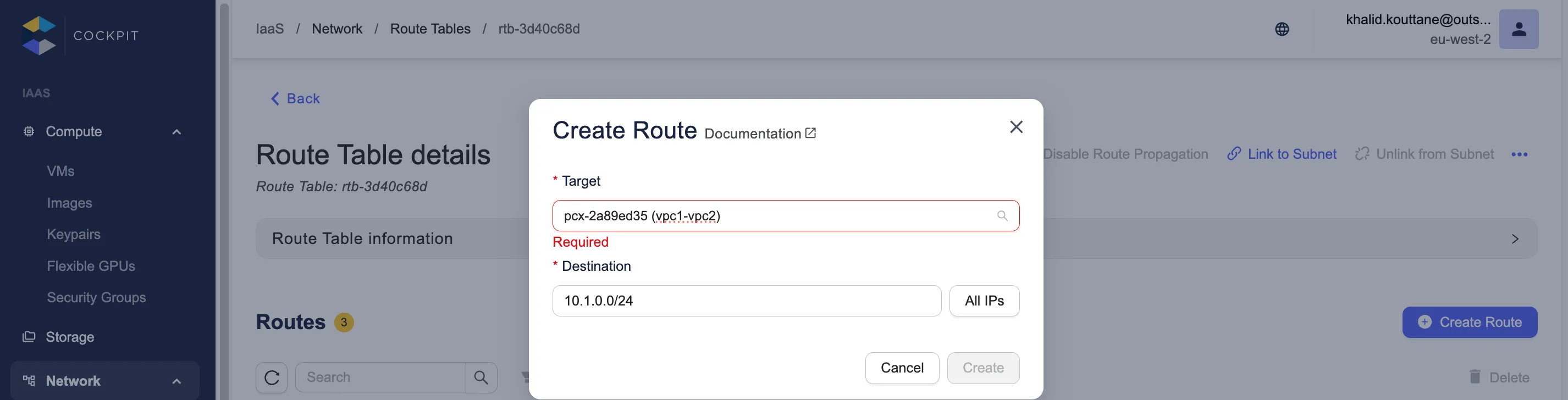 Chacun des propriétaires des VPC doit créer une nouvelle route avec le bloc CIDR de l’autre VPC en destination, et l’ID de la VPC peering connection en target. Cela permet aux instances de diriger le trafic entre les deux VPC.